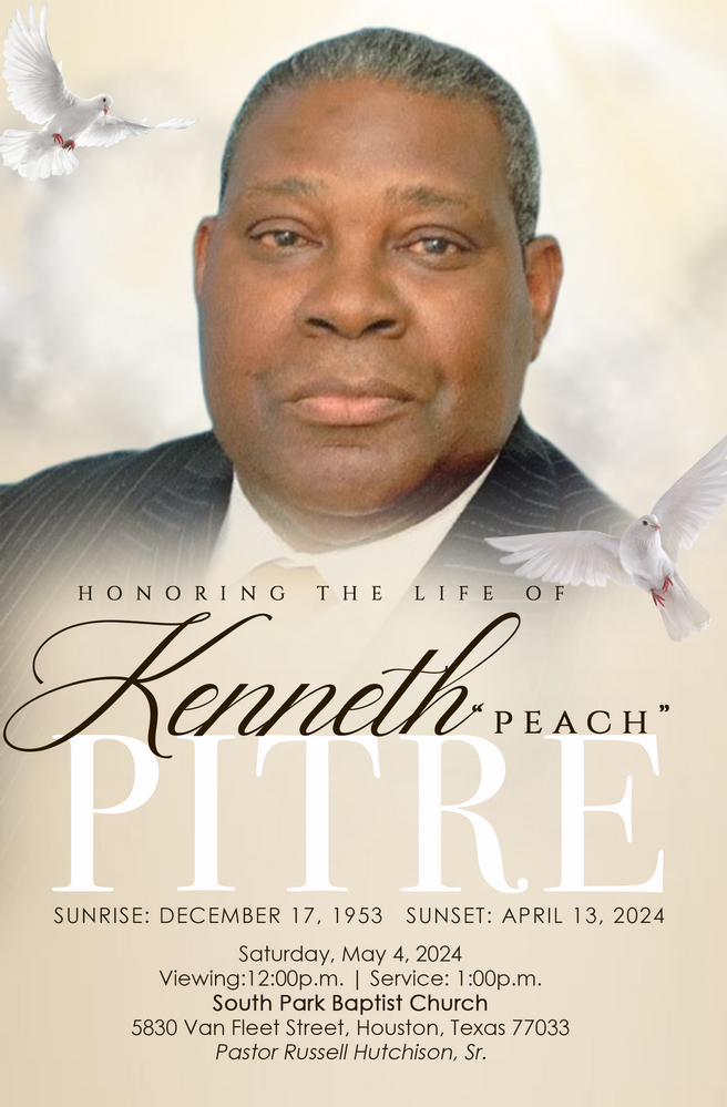My deepest condolences to the family of Mr. Kenneth Pitre. May God comfort your hearts and strengthen you during this time. R.I.P. Bro. Pitre.